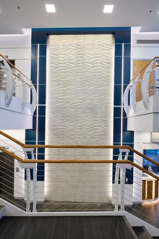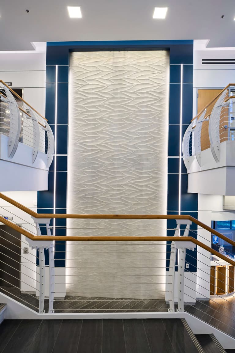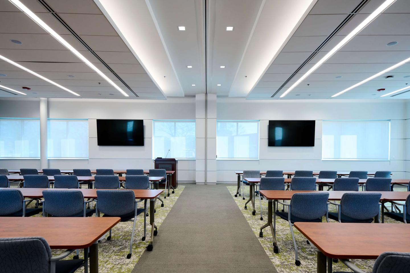 The First Floor includes 9,623 SF with the main entrance opening into a three story Atrium area with vertical circulation and Public Restrooms, seven private offices for the Registrar, two hour rated vault room for student records, two private offices and four cubicles for Enrollment Management, a large storage area for university promotional materials and document shredding, a large employee lounge, a shared storage room, a mechanical room, and a number of facilities that support the university.