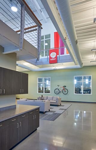 Inside, the program includes men’s and women’s locker rooms, side door access for cyclist employees, a large lunchroom, training room, small conference rooms, and open office space. The mezzanine contains an open office, large conference room and toilet rooms; access is provided from the first floor via a monumental stair and passenger elevator.
